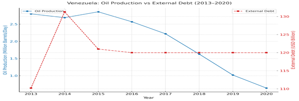 Venezuela’s oil production vs. external debt (2013–2020)