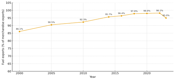 Venezuela rose to power due to oil. From the mid-20th century onward, the national oil company PDVSA (Petróleos de Venezuela, S.A.) turned the country into a petrostate. By the early 2000s, oil exports accounted for more than 90% of Venezuela's total revenue. Oil dependency provided a facade of stability. When oil prices reached over $100 per barrel, the government borrowed money with the belief that this could grow indefinitely.